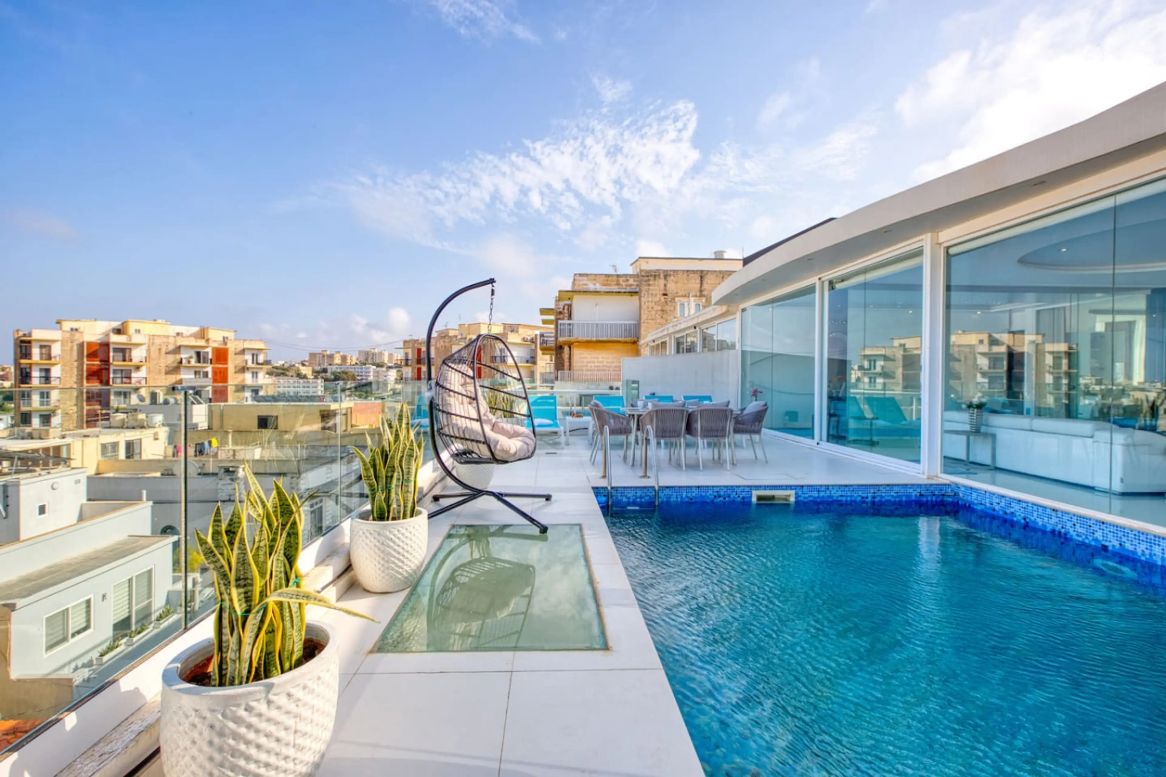 Step into pure indulgence at this stunning all-glass penthouse in Swieqi, just minutes from Malta’s best beaches, vibrant nightlife, and world-class dining. Perfect for couples, families, or groups of up to 6 guests, this sleek and spacious apartment blends modern luxury with Mediterranean charm. W...